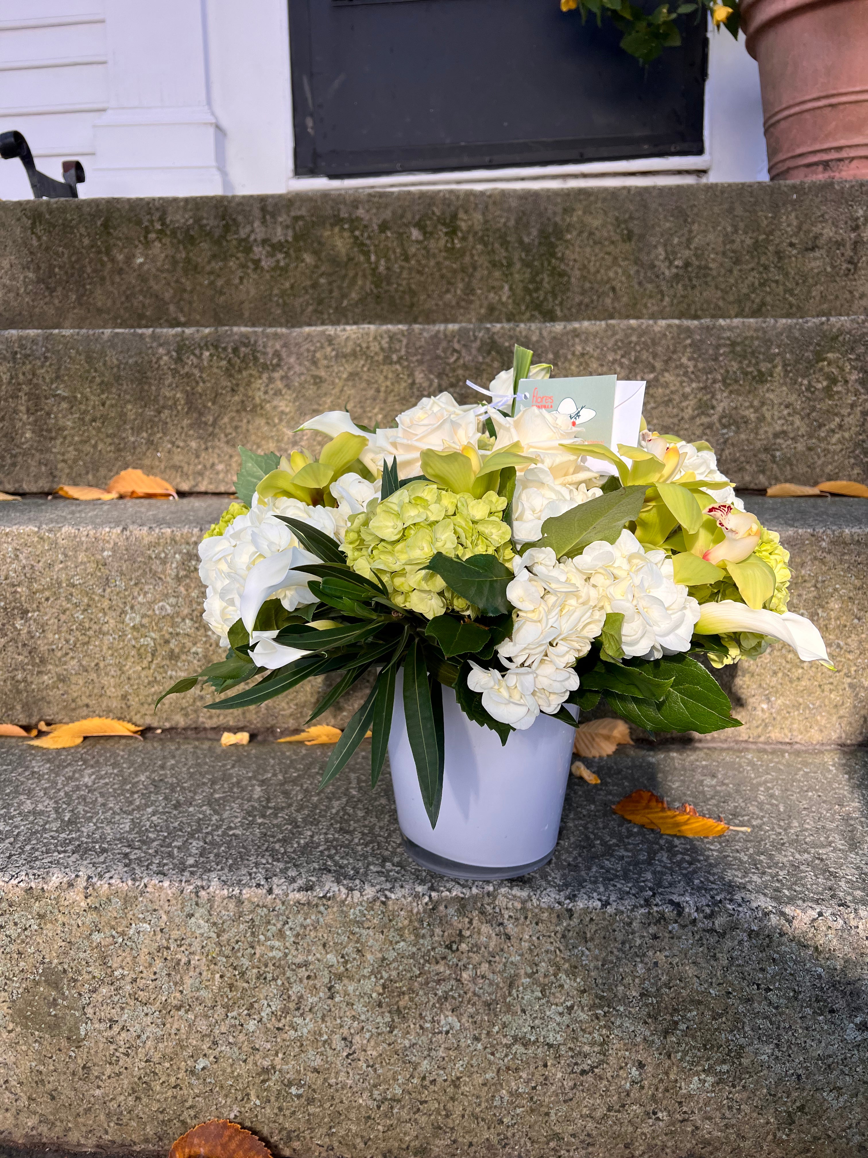 Late summer garden classics combine with delicate orchids and dramatic greens in a beautiful arrangement.
