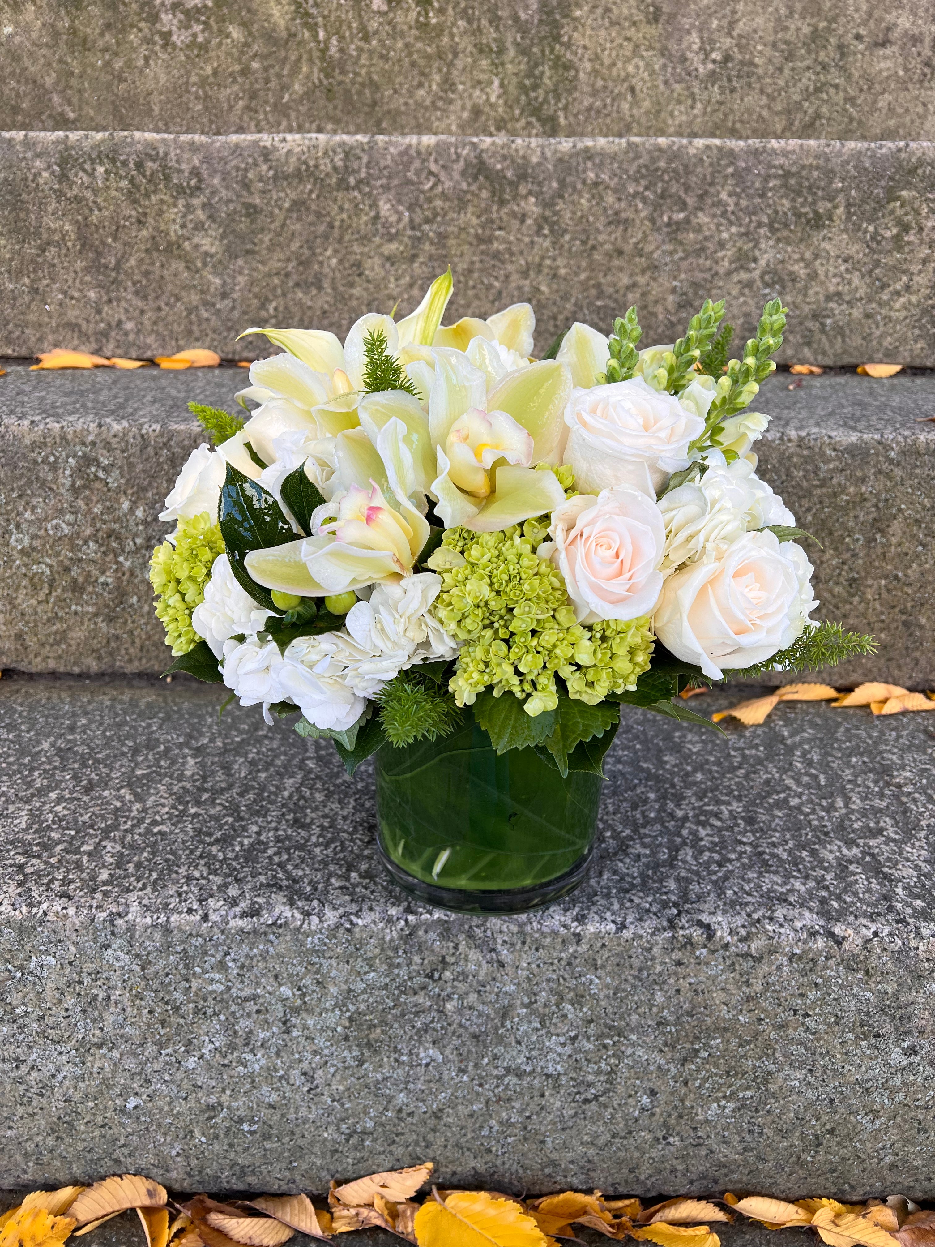 Delicate textures, exotic orchids, and classic colors combine in a stunning end-of-summer seasonal arrangement. Perfect for a hostess gift for the high holidays.