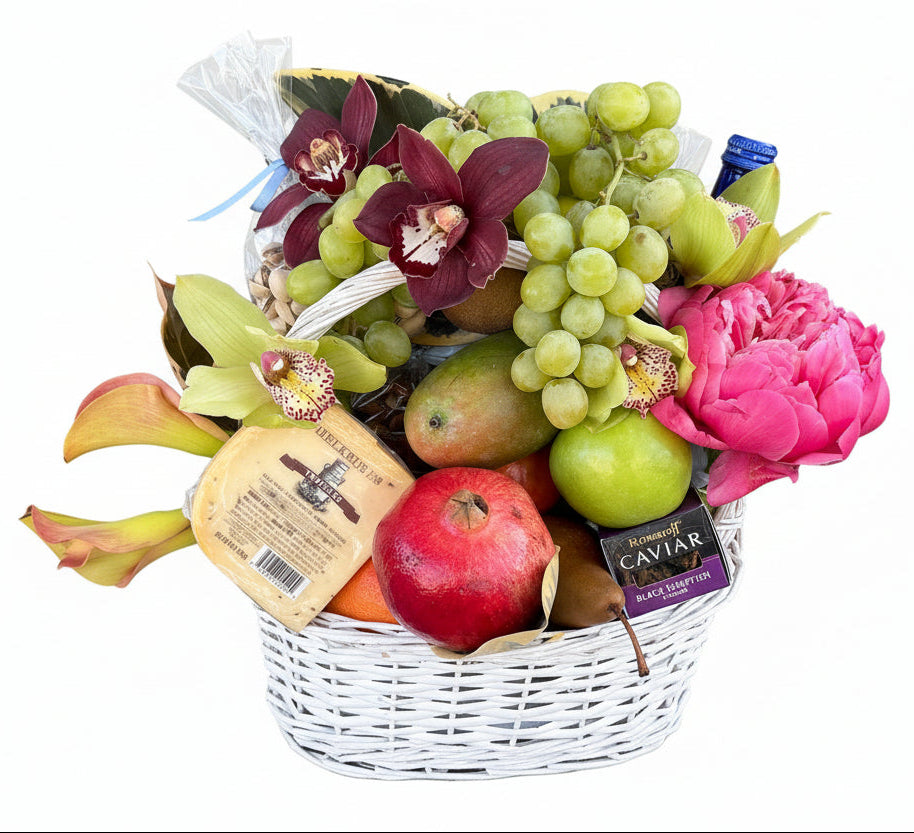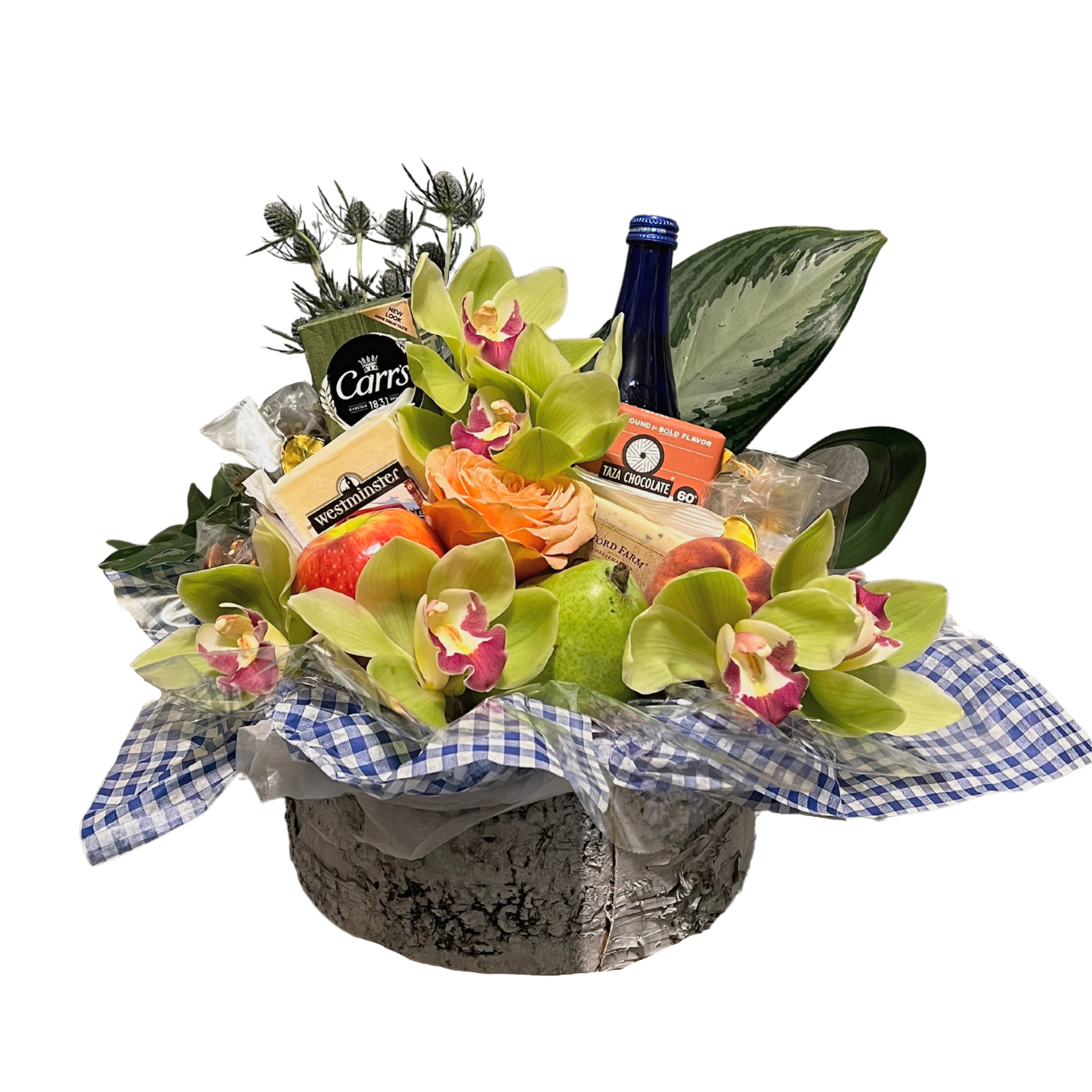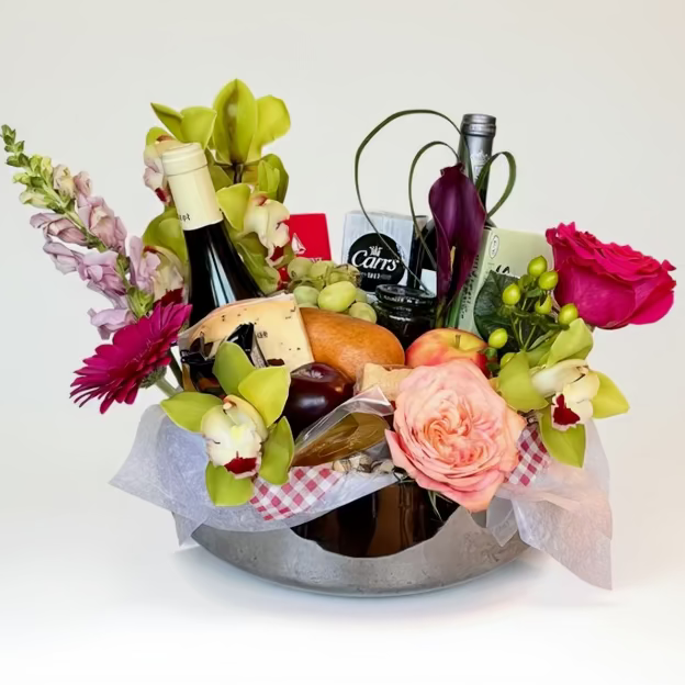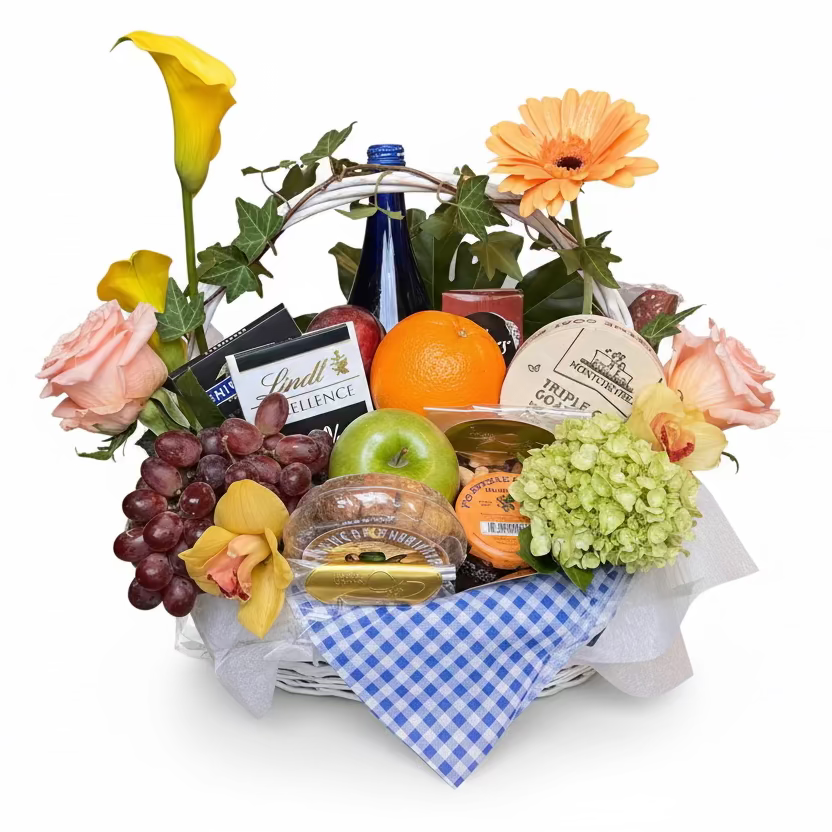 Seasonal fruit, gourmet cheese, crackers, premium chocolate and assorted nuts are staples of this great gift. All gift baskets are delivered in a decorated basket with your choice of wine. Non-alcoholic options are available too.